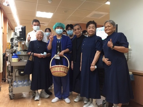 左圖:八十幾歲的林阿美師姊(中),把花蓮慈院當成自己家,只要還有體力,一定會緊緊跟著上人。(圖/陳炳宏)