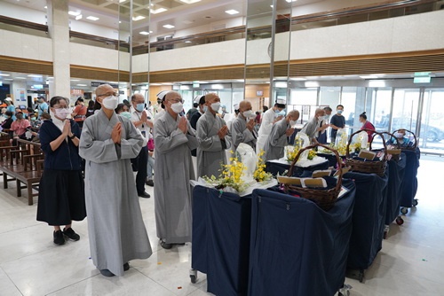 左圖:下午3點前在祈福會之前,靜思精舍德宇師父、德瑅師父、德募師父、德棨師父、德恕師父和德潔師父向佛陀問訊後帶領護理部護理長,以及人文室同仁,分四動線前往病房,祝福病人、家屬及法親。(陳炳宏/攝)