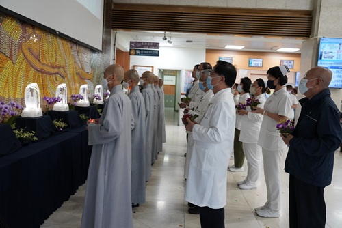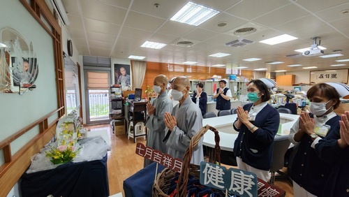 下午3點,在祈福會之前,靜思精舍德宇師父、德瑅師父、德募師父、德棨師父、德恕師父和德潔師父帶領護理部護理長陳陶霈瑜、李美貞、楊佩雯、李惠蘭、張素雯、周云鵑等,以及人文室林永森、吳淑潔、顏玉惠、鄧淑卿,分四動線前往病房,祝福病人、家屬及法親。