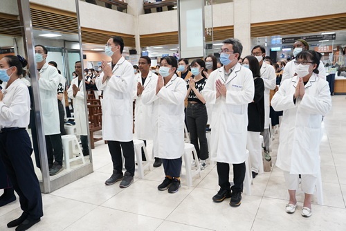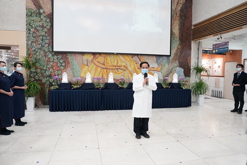 左圖: 祈福會開始,林欣榮院長為吉祥祈福會獻上祝福,祈禱院內病人、家屬、同仁、與家人都平安歡喜。(陳炳宏/攝)