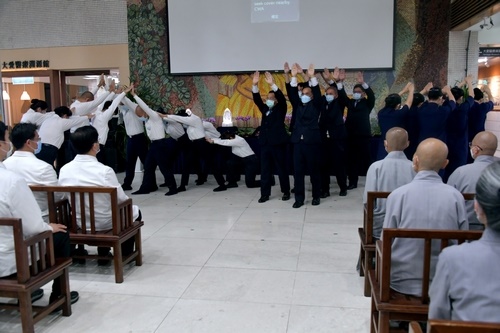 圖:祈福會結束前,精舍師父、社區志工、院內職志同仁及會眾一起唱誦祈禱,祈求天下無災難。(陳炳宏/攝)