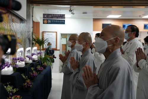 之後,隨即由精舍師父帶領虔誠唱誦「開經偈」。林欣榮院長、何宗融副院長、吳雅汝醫師、高聖博醫師、葉士源醫師、林佑融主任,以及護理部主任鍾惠君、副主任王琬詳及李美貞護理長、田淑惠護理長、與印尼企業家劉鎱輝賢伉儷與女兒等人代表獻供,禮敬諸佛,高舉心燈祈願,鼓勵人人齋戒茹素行善,祝福家家平安吉祥。