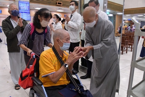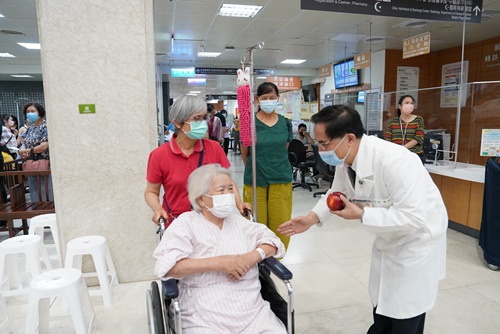圖:祈福會結束,林欣榮院長(左圖)與精舍師父(右圖)親送象徵平安的蘋果給住院病患,期許在歡喜的吉祥月,將正信、正念推廣出去,破除迷思,並祈求人人平安。