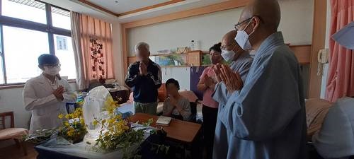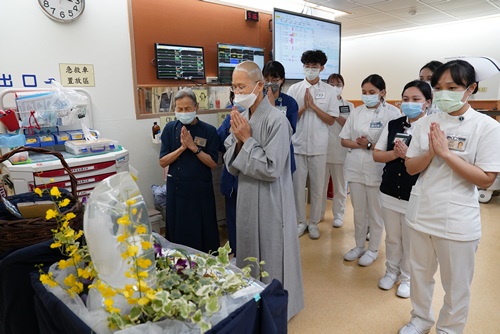 右圖:德瑅法師(中)帶領志工鄧淑卿、與李美貞護理長、護理同仁向宇宙大覺者問訊祝禱病人、家屬、同仁都平安。(陳炳宏/攝)