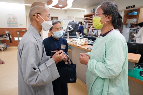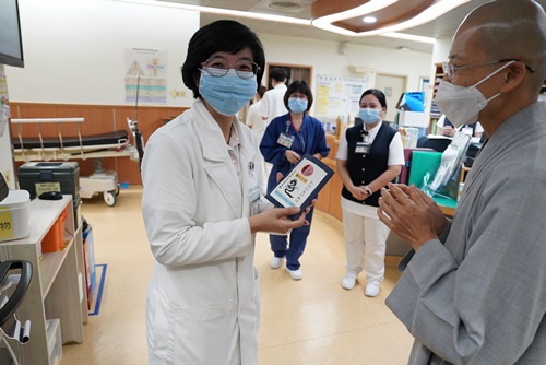 陳陶霈瑜護理長提到,加護病房有精舍德宇師父帶來祝福,同仁都感受到歡喜心,感恩師父送上祝福的米菓給病人及家屬。