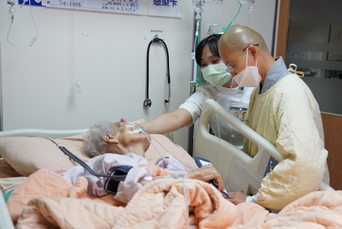右圖:德恕師父、德潔師父與住院病人一起虔誠祝禱。(吳淑潔/攝)