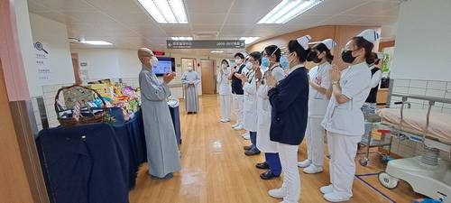 左圖: 德募、德棨師父到護理部帶領主管祈福祝禱。(林永森/攝)