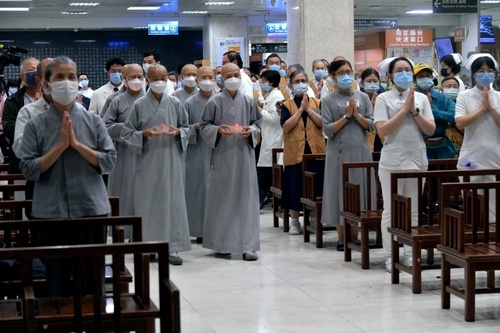 左圖:花蓮慈院8月7日下午四點五十分在醫院大廳佛陀問病圖前舉行吉祥祈福會,由靜思精舍師父德宇師父、德瑅師父、德募師父、德棨師父、德恕師父和德潔師父帶領進場唱誦「開經偈」。(廖文聰/攝)