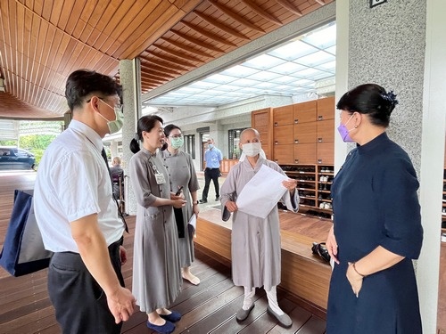 左圖:石崇良署長(左三)在林欣榮院長(右二)、吳彬安副院長(右一)、何宗融副院長(左二)、陳星助副院長(左一)等人陪同,與 上人會談。