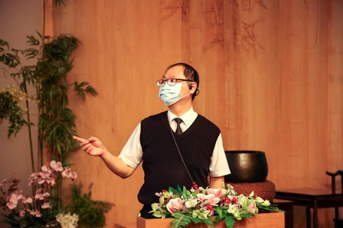 左圖: 德瑋師父代表精舍師父致詞,歡迎同仁「回家」,並分享他上週參加法脈宗門營的心得。