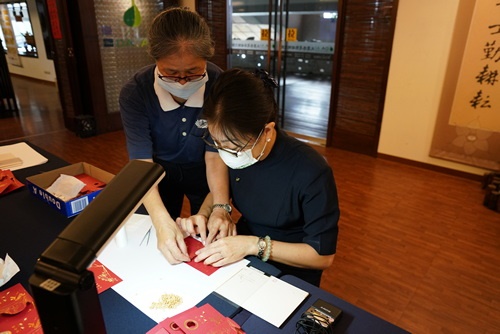 左圖:林院長夫人夏玉心在志工溫碧櫻師姊協助下,細心黏上宇宙大覺者。