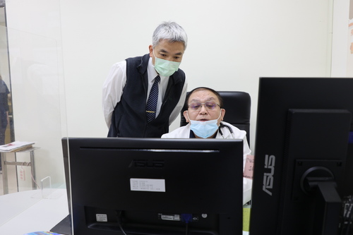 右圖:林希賢主任(右)示範衛生所所使用的醫療系統,讓梁忠詔主任了解熟悉。