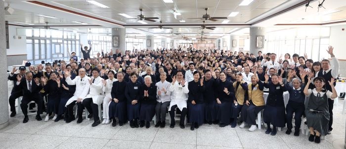 小朋友表演之後,則由顏靜曦師姊領著比孩子們都年長一世紀以上、在慈院服務資歷都超過三十年的志工上臺,讓這群用漫長歲月護持慈院的志工菩薩們被看見。志工菩薩們獻上早期耳熟能詳的手語歌〈大家有愛〉:「大家有愛、大家有愛,白雪都融化;心中有愛、心中有愛,黑暗變光明;無緣大慈、同體大悲,服務最快樂;彼此感恩、彼此感恩,大家都圓滿。」緩緩清唱時,樸實無華的歌聲搭配優雅手語,讓人更感受到簡潔歌詞中富含的真義與深意。花蓮慈院手語社此時則接力「讓愛傳出去」獻給所有志工,因為醫護團隊堅守崗位努力向前衝刺一整年,趁著一年的尾聲,才有機會向整年都自發協助醫療運轉的志工表達感恩,餐會現場彷彿時空交錯,更充滿世代同堂與傳承的精神。