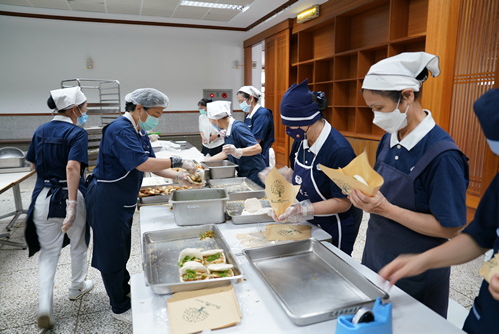 圖說(下):慶祝院慶,花蓮慈院同心圓餐廳供膳組也製作一千五百顆壽桃、志工製作一千個刈包,與民眾、門診醫護同仁分享生日喜悅。