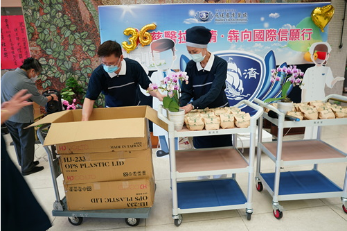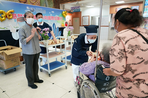 慶祝院慶,院長特別準備了36周年限定禮給參與志工早會的同仁外,花蓮慈院同心圓餐廳供膳組也製作一千五百顆壽桃、志工製作一千個刈包,與民眾、門診醫護同仁分享生日喜悅。常住志工顏靜曦師姊說,醫院過生日就是要民眾一起歡喜,特別感恩桃園區志工、醫師及基金會主管的親屬約十二人,早上近八點就開始幫忙做美味素食刈包;另外台中區八位志工幫忙分裝壽桃。另外,在下午院慶祈福同步啟動的「回饋佛陀的故鄉共福善」報佛恩活動,首日募心募愛七萬六千元。(文/陳炳宏;圖/黃思齊、陳安俞、陳炳宏)
