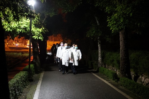 圖說:清晨4點多,天還未亮,花蓮慈院林欣榮院長、王志鴻副院長、何宗融副院長帶領同仁迎著綿綿細雨在悶熱的雨天,回到心靈的故鄉「靜思精舍」,與全球的慈濟家人一起慶祝慈濟59周年慶。
