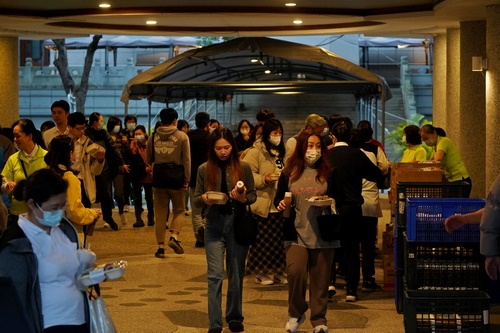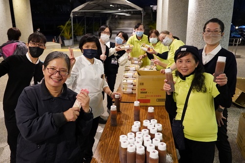圖說:活動開始前,同心圓廣場早已人聲鼎沸,同仁們手中提著象徵「蘋」安、「桔」祥和「棗」福的妙膳廳餐盒,還有健康的紅豆薏仁飲,讓同仁在忙碌了一天後,可以即時補充能量迎接望年會。