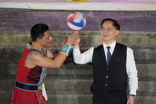 圖說:表演途中,蒞鈴娛樂表演工作室老師更走下台與林欣榮院長互動,他將手中快速轉動的排球傳到林欣榮院長手中(左圖),俏皮的院長甚至舉起手臂秀給大家看(中圖),逗得全場笑聲不斷,掌聲熱烈。