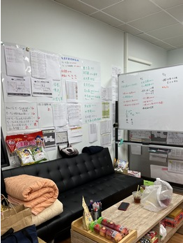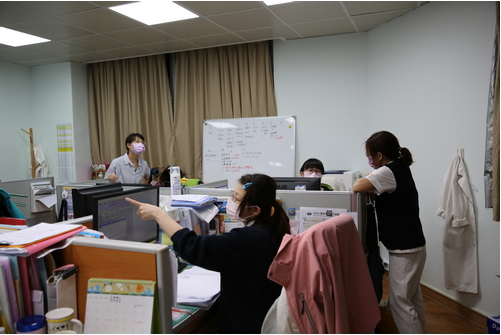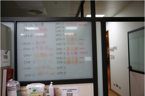 連續兩週下來,感管室團隊包括黃妙慧主任等人幾乎以院為家,在小小的辦公室裡,白板已不夠用,牆壁上貼滿一張一張的紙,是病房空間圖,入口處的霧面玻璃上,手繪格子圖上是一個確診病人的名字與病室號碼。每天的日常就是會議、巡病房、以及來自院內各單位的諮詢電話、衛生局的電話,電話分機的來電還沒講完,手機響了,趕快轉給其他位置上的同仁……或者是講著手機的電話,辦公桌上的分機又響了,另一個剛講完電話的同仁趕忙接起……就這樣,到最後每個人接的都不是自己的電話。