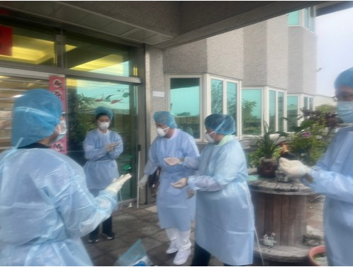 無可否認,「在這過程中,『被需要』是一種成就感」江惠莉組長說。因此,當疫情一爆發,沒有採檢人力,感控護理師就下去採檢;衛生局指示,安養中心有護理師確診,慈濟醫院須負責採檢,社區健康中心護理師認為要有感控護理師同行才有安全感,於是感控護理師就陪著社區健康中心的夥伴,江惠莉笑著說,「大家就像小學生一樣圍成一圈,從穿戴防護裝備開始,一個命令一個動作……。」