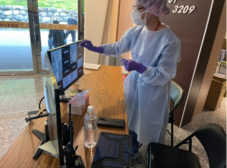 左圖:在接手加強型防疫旅館照護任務之前,為確保同仁的安全,感管室先到旅館做環境採檢,圖為黃妙慧主任。(江惠莉提供)