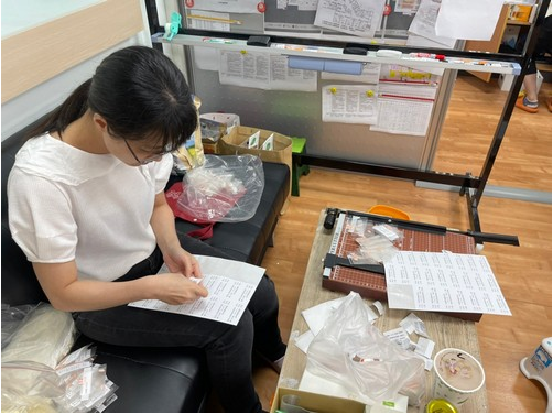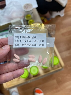 另外,四月二十五日至五月一日,花蓮慈院承擔社區快篩,因為快篩陽性者通常多已出現不舒服症狀,因此感管室團隊先想出三種緩解症狀的處方藥包,讓急診醫師在幫快篩陽性者做PCR篩檢時,針對症狀開藥,讓他們在住處等候PCR檢測結果前可以先就症狀治療。江惠莉笑著指出,因為時間很趕,快篩陽性者人數又多,感管室團隊也立即補位,先以貼紙說明方式,提醒民眾服藥注意事項(如下二圖,左圖為黃妙慧主任。江惠莉提供),並在辦公室手工作業;這構思之後臺北市市長柯文哲也在五月二日提出,「我們比臺北市還早」。(文/游繡華)