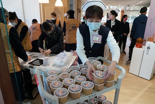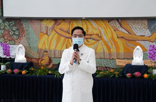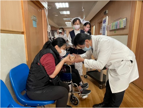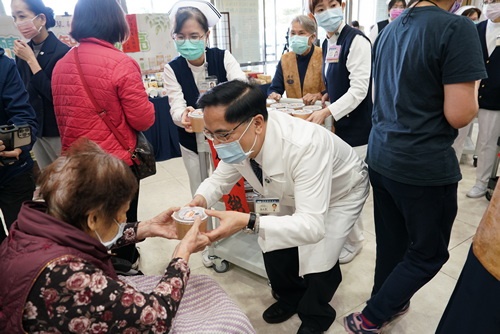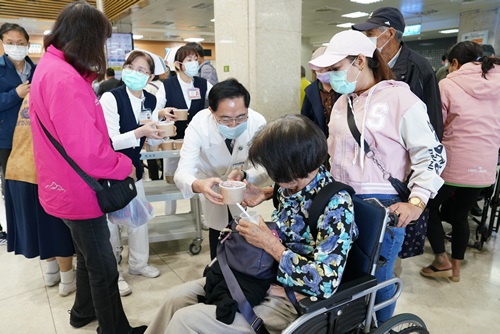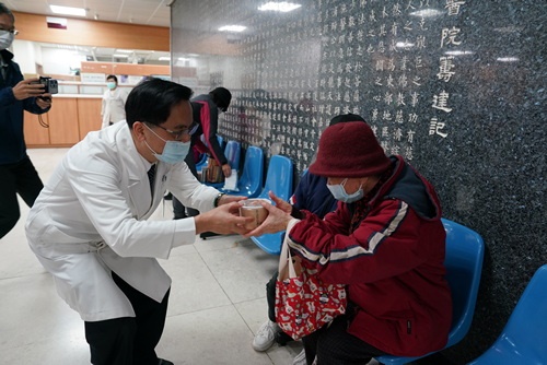 右圖:何宗融副院長用「慈悲行善臘八粥」祝福來看診的病人。