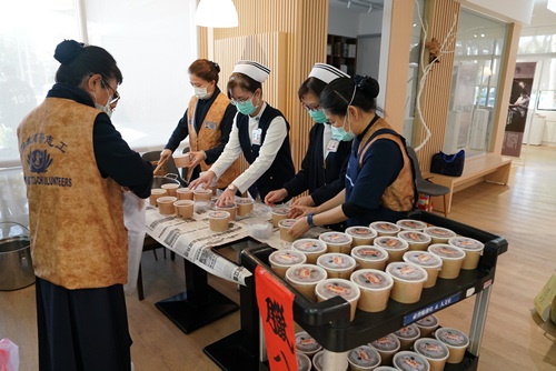 左圖:護理部葉秀真副主任(右三)、張智容督導(右二)、志工室組長張秀芳師姊(右一)與醫療志工合力把臘八粥裝滿裝好上架。(陳炳宏攝)