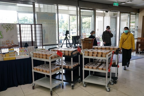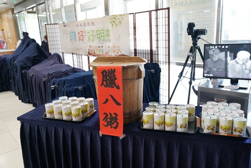 右圖:近九點半人文室已經擺好臘八粥,也準備好竹筒讓民眾也能弘法利生。(陳炳宏攝)