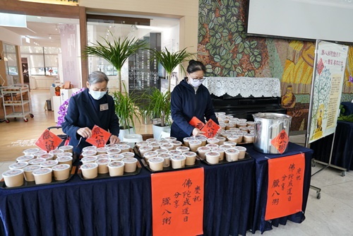 左圖:鄧淑卿師姊(左)與人文室吳淑潔忙著佈置大廳,以便待會兒發放「慈悲行善臘八粥」。(陳炳宏攝)