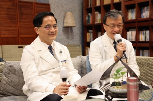 左圖:院長林欣榮(左)、醫務秘書李毅(右)帶領花蓮慈院青銀共好團隊共同接受警察廣播電臺採訪。