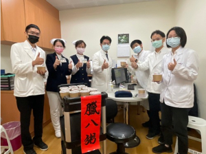 左圖:何宗融副院長(中)也歡喜跟同仁分享「慈悲行善臘八粥」。