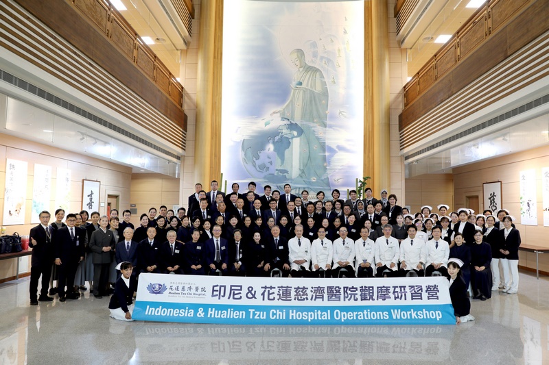 圖:印尼慈濟醫院25日參訪花蓮慈院進行觀摩研習,雙方出席人員先在協力樓大廳合影留念。