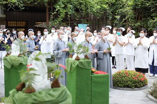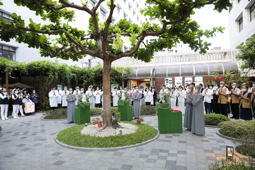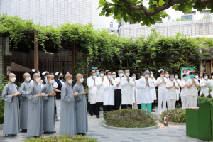 花蓮慈濟醫院八月十日下午四點在心蓮病房空中花園舉辦「孝親感恩祈福會」,在靜思精舍師父帶領下,院長林欣榮及院長室主管、醫師、護理師、醫技行政同仁、志工,以及病人、家屬共同唱誦「佛在靈山」,並虔誠禮敬諸佛,高舉心燈祈願,鼓勵人人齋戒茹素行善,祝福家家平安吉祥。