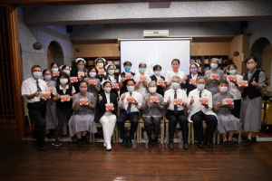 「送您一份愛的禮物,我祝您幸福」花蓮慈濟醫院門診大廳八月八日中午響起「祝您幸福」悠揚歌聲,院長林欣榮、副院長吳彬安、何宗融、陳星助、以及護理部主任鍾惠君、副主任王琬詳、呂基燕,督導鄭雅君、李彥錚、戴佳惠、張智容、周英芳、蘇芬蘭等人,為常住志工及梯次醫療志工慶祝父親節。
