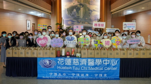花蓮慈院院長林欣榮特別感恩 上人護持醫院、疼惜同仁。贈送全院端午佳節七覺支祝福禮。請同仁要珍惜物資來源不易,飲水要思源,知福、惜福、再造福,知恩、感恩、再報恩。