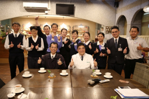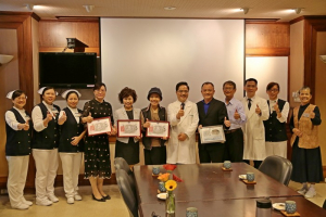 「感恩來自高雄的實業家,捐贈輔具及手術刀等,造福更多的病友。」林欣榮院長、神經外科部副主任蔡昇宗、社服室副主任顏惠美、護理部代理主任鍾惠君,感恩實業家楊順合的促成