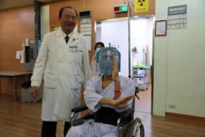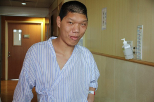 患有腦下垂體腫瘤,造成肢端肥大症的河南青年郭明陽,一月二十二日由骨科部吳文田主任進行微創脊椎內視鏡椎間盤切除術後,左下肢疼痛已經大幅改善外,也開始積極復健。郭明陽每天都給自己不同的功課,每天練習不同的動作,要求自己一天比一天進步,來回報醫師與醫療團隊的照顧。