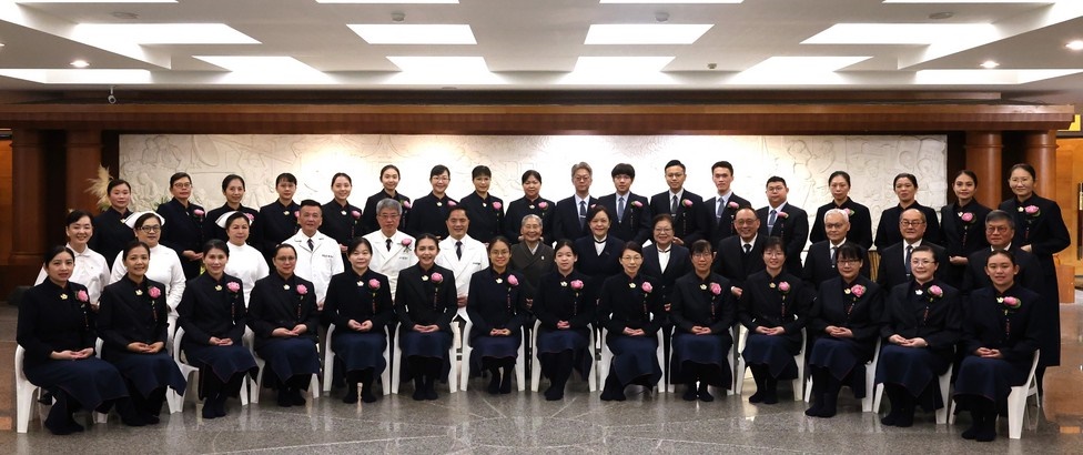 一月十九日上午,最後一場歲末祝福在花蓮靜思堂舉行,慈善、醫療、人文、教育四大志業及海外家人等一千五百多人虔誠祈願「人心淨化,社會祥和,天下無災難」。三十二位受證的師兄師姊中,花蓮慈濟醫院有九人,其中有三位護理師,謝金美與陳皆吟是來自馬來西亞,在慈濟大學完成學業後,便在病房服務;感染管制室護理師何翠華,帶著小女兒一起入經藏。