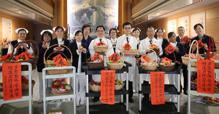 花蓮慈院三百六十五天守護生命不打烊。今天是除夕,許多醫護仍留守在第一線,花蓮慈院院長室、護理部與人文室不忘鼓勵與感恩堅守崗位的醫護人員,由林欣榮院長、陳培榕副院長和吳彬安副院長分三條路線,一一送上祝福和鼓勵,感恩留守人員犧牲假期的付出,同時讓住院病人也能感受到年節氣氛,「什(蛇)麼都健康」、「什(蛇)麼都平安」,放寬心早日康復回家與家人團圓。