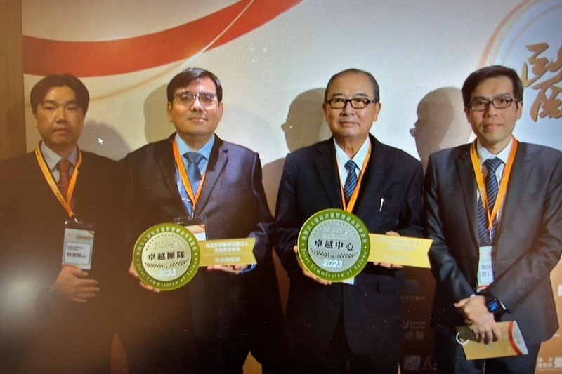 中圖:檢驗醫學科以「檢驗流程數位轉型」榮獲智慧醫療類標章,由檢驗醫學科主任張淳淳(左二)代表受獎。(攝/游濬紘)