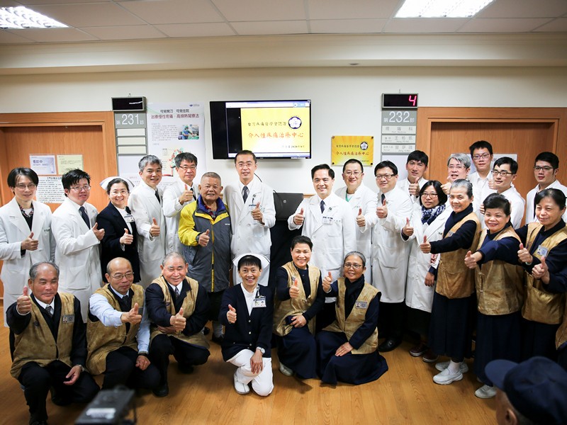 圖:病人張添發先生(左四)感恩疼痛中心王柏凱醫師帶領醫療團隊,為他進行「高頻熱凝療法」,讓他能成功擺脫下背痛的困擾。