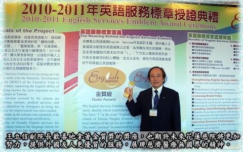 為了 提供在台外籍人士更友善的生活環境,行政院研考會結合地方政府與民間業者,推動英語服務標章,今年一共包括有購物消費、住宿餐飲、醫療服務和交通運輸等各 個行業的1,565家業者參與,共有83家業者獲得「金質級」的標章認證,其中花蓮慈院與大林慈院更是雙雙獲得英語服務標章金質獎的肯定。二十八日下午,由花蓮慈院王立信副院長代表佛教慈濟綜合醫院授獎,也期許未來花蓮慈院將更加努力,提供外國友人更優質的服務,展現慈濟醫療無國界的精神。