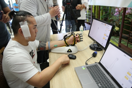 「遊戲式的復健可以加強復健的意願。」去年六月因為中風導致左半側偏癱的陳金鷹表示,接觸智能復健機器人已經兩個月了,感覺恢復進度很好,跟傳統復健比起來,復健機器人的方式更有趣也更有效,尤其是螢幕上即時就能看到現在的施力狀況,可以知道自己現在是哪條肌肉在運動,然後該怎麼去加強,找回自己活動的方式,進度的幅度自己都能清清楚楚的了解。