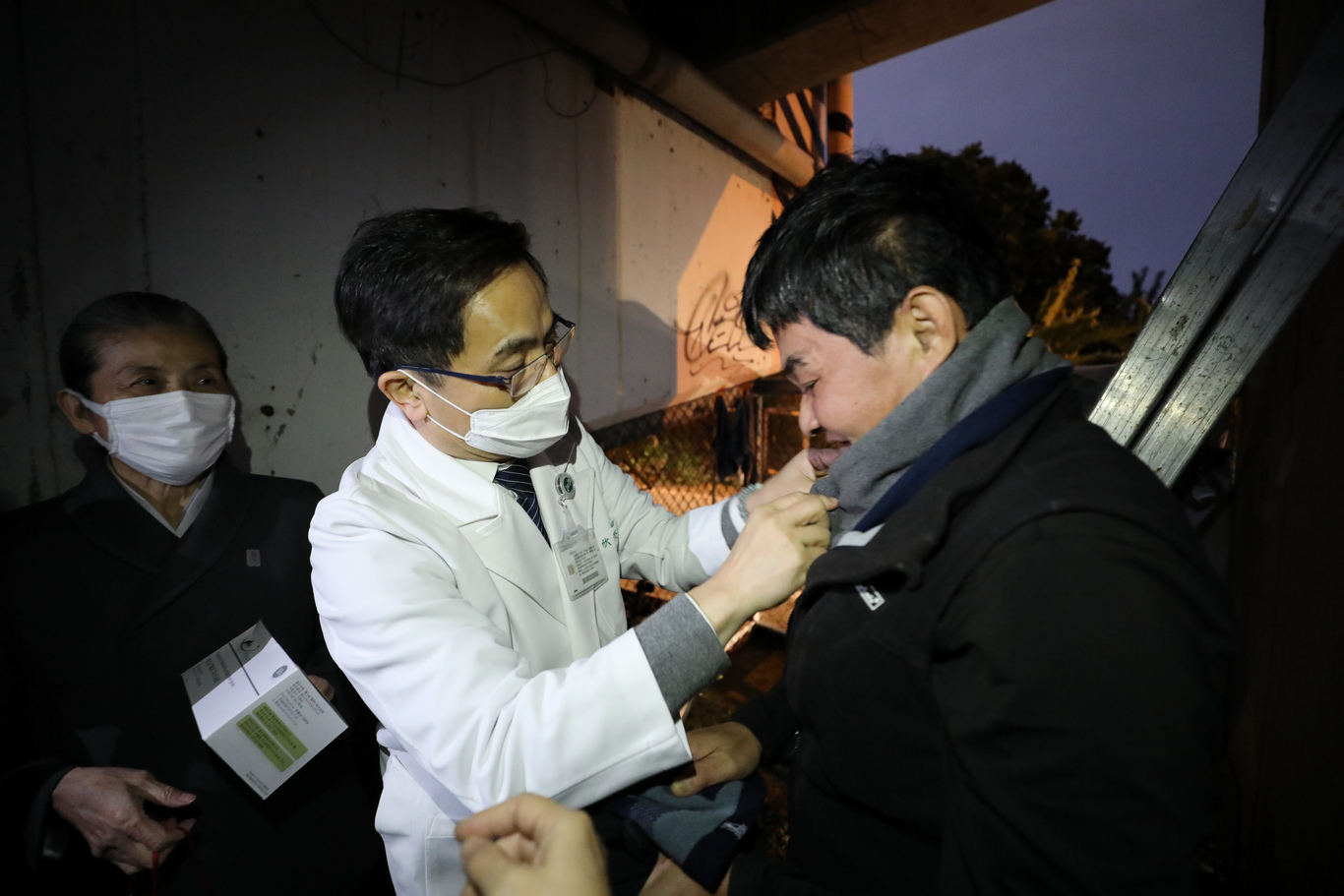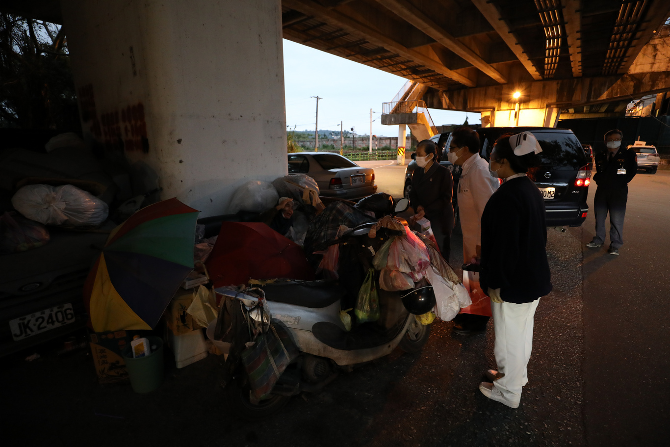 「沒辦法,我只有一隻襪子。」住在橋下的李先生(化名),在廢棄沙發上撐起三支雨傘,就是他遮風避雨的容身之處,幾乎無法抵擋入夜後的低溫。林欣榮院長拿出準備好的毛帽、圍巾、手套與襪子,細心為李先生戴上,並提醒他包含頭頸、四肢在內,全身上下都要做好保暖。