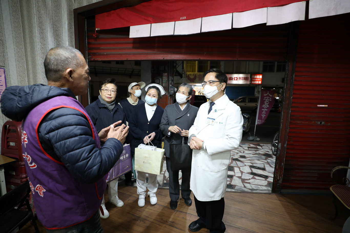 ,30日白天也在社會服務室副主任顏惠美(靜曦)師姐的帶動下,緊急打包禦寒物資,趁著傍晚天色微暗時分,由花蓮慈院院長林欣榮與護理部主任鍾惠君,親手送到附近的街友手中。
