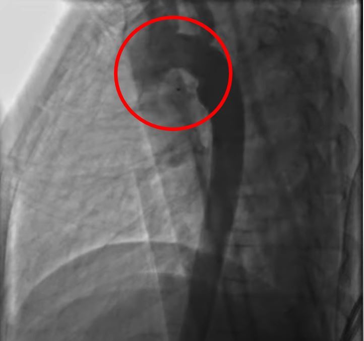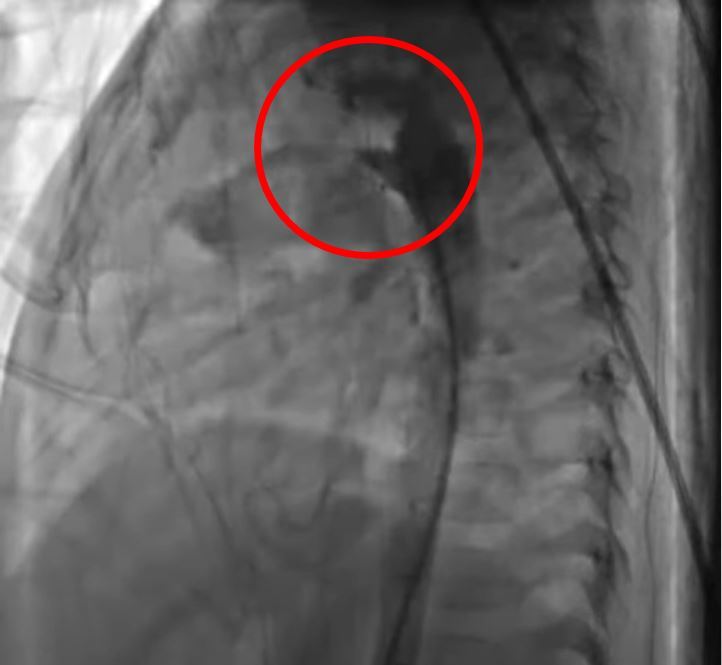右圖:經心導管治療放置閉鎖器後,血液不再流入肺動脈。