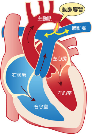 圖說:主動脈與肺動脈之間相通的血管稱為動脈導管,一般在寶寶出生後二至三天會進行功能性閉鎖,開始了由肺部呼吸的肺循環,若未關閉,部份壓力較高的主動脈血液會流入肺動脈,加入肺循環而引起肺充血,稱為「開放性動脈導管」。