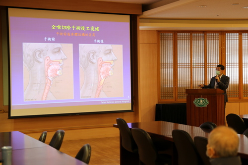花蓮慈院副院長陳培榕表示,東部地區因為地形狹長,很多時候病人因為路途遙遠或心理障礙走不出來,雖然花蓮慈院成立口口相傳病友會,支持鼓勵包含口腔癌在內的頭頸部癌症病友,其中無法說話的喉癌或下咽癌等患者,也是需要被照顧的弱勢族群,花蓮慈院除了有復健科語言治療師和物理治療師,提供無喉病友每週兩次學習發聲器、食道語和肩頸運動外,也與無喉者復聲協會合作,提供教學場地,希望能讓更多病友免去奔波,就近學習食道語。