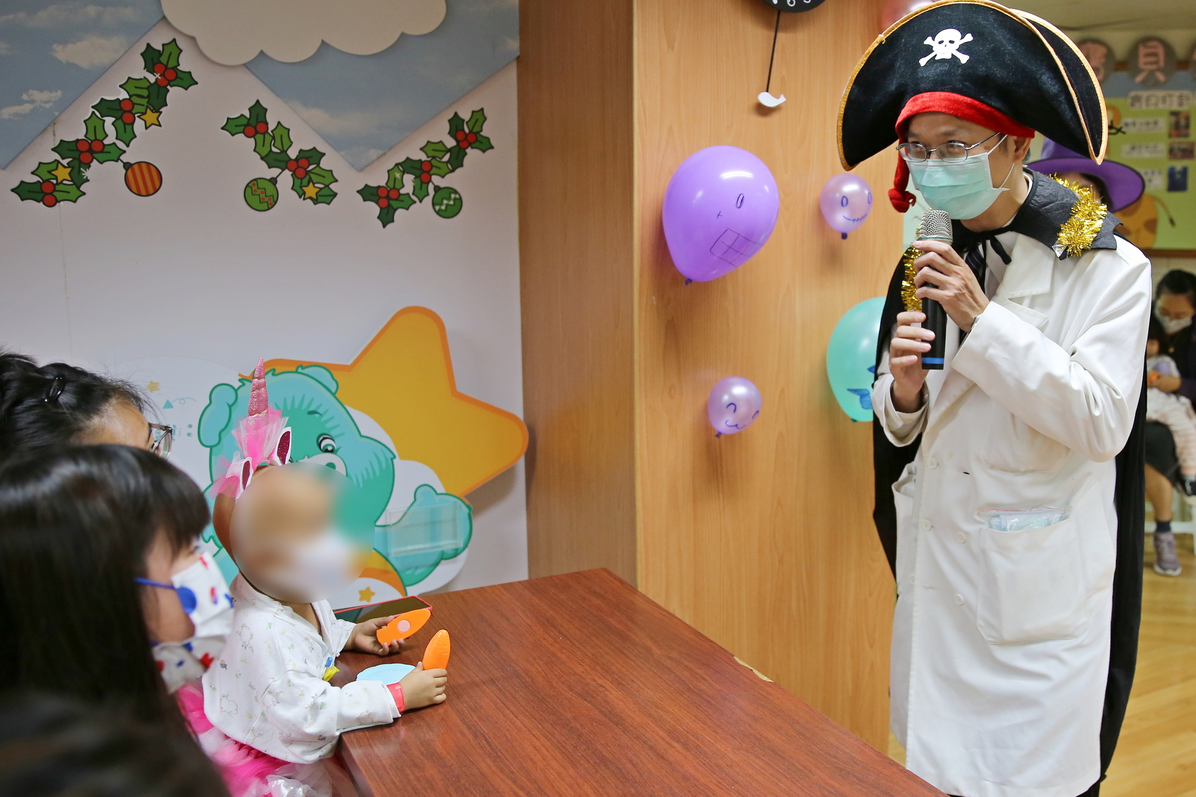 「水蜜桃是不是蔬菜?紅蘿蔔是不是蔬菜?」化身為海盜的陳明群主任,考考在場每位小朋友自己所選的營養健康餐盤裡的食物是蔬菜還是水果。陳明群主任表示,越來越多的研究指出,從小開始吃糖,對身體的負擔會愈來愈多,所以透過「我的健康餐盤」遊戲,讓病童認識自己所選擇的食物外,也希望孩子們能從小建立健康及正確的飲食觀念。